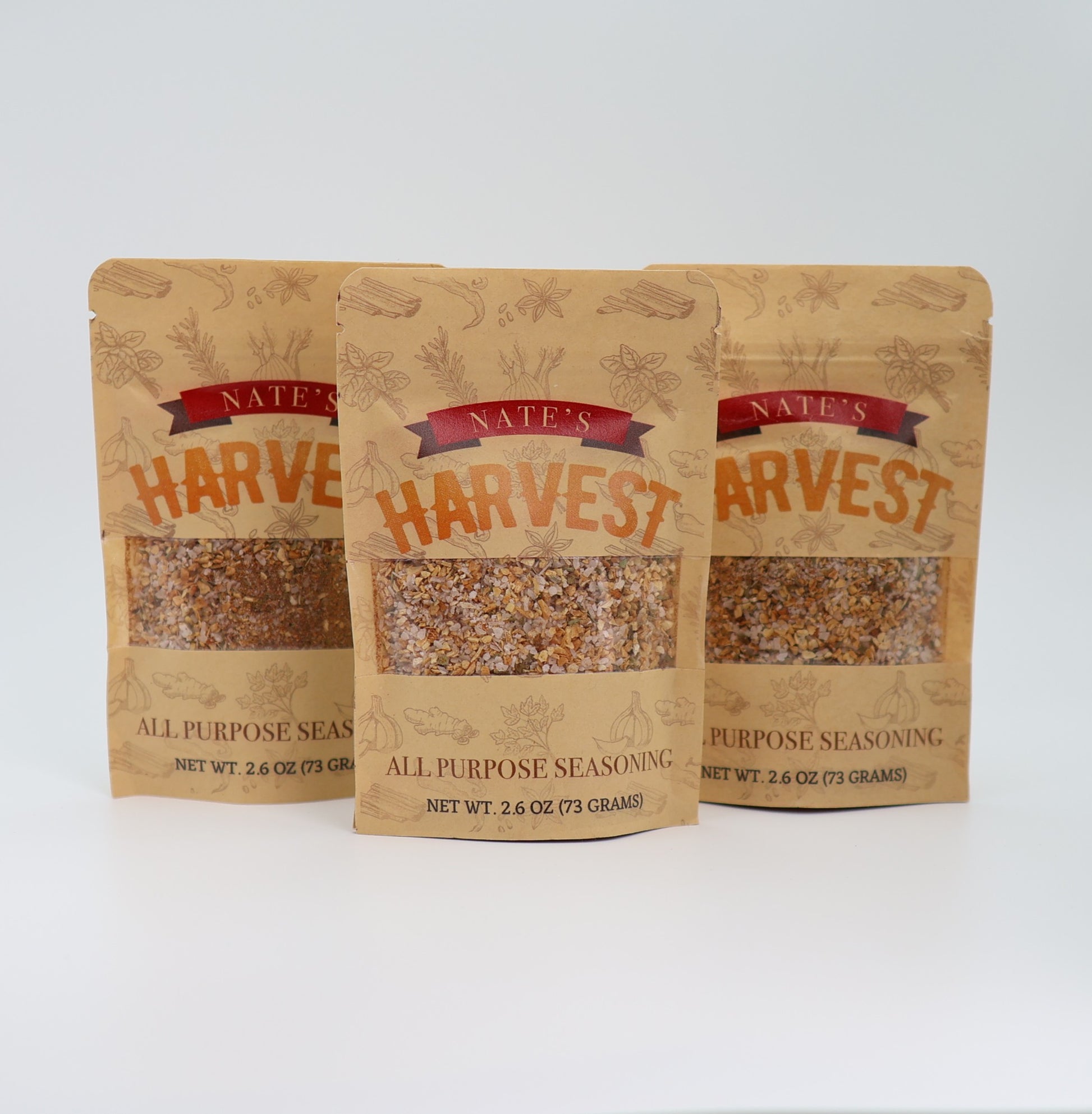 Nate’s Harvest All Purpose Seasoning – A bold blend made with love, right from our local, family-owned kitchen. Sustainably crafted and now expanding to bring fresh flavor to homes everywhere, this all-natural seasoning is zero calories, sugar-free, and packed with coarse herbs perfect for your salt/pepper grinder or just your fingertips. Each 2.6 OZ pack delivers powerful taste in every pinch—because with this seasoning salt, a little truly goes a long way. Guaranteed to elevate your meals and please your palate.